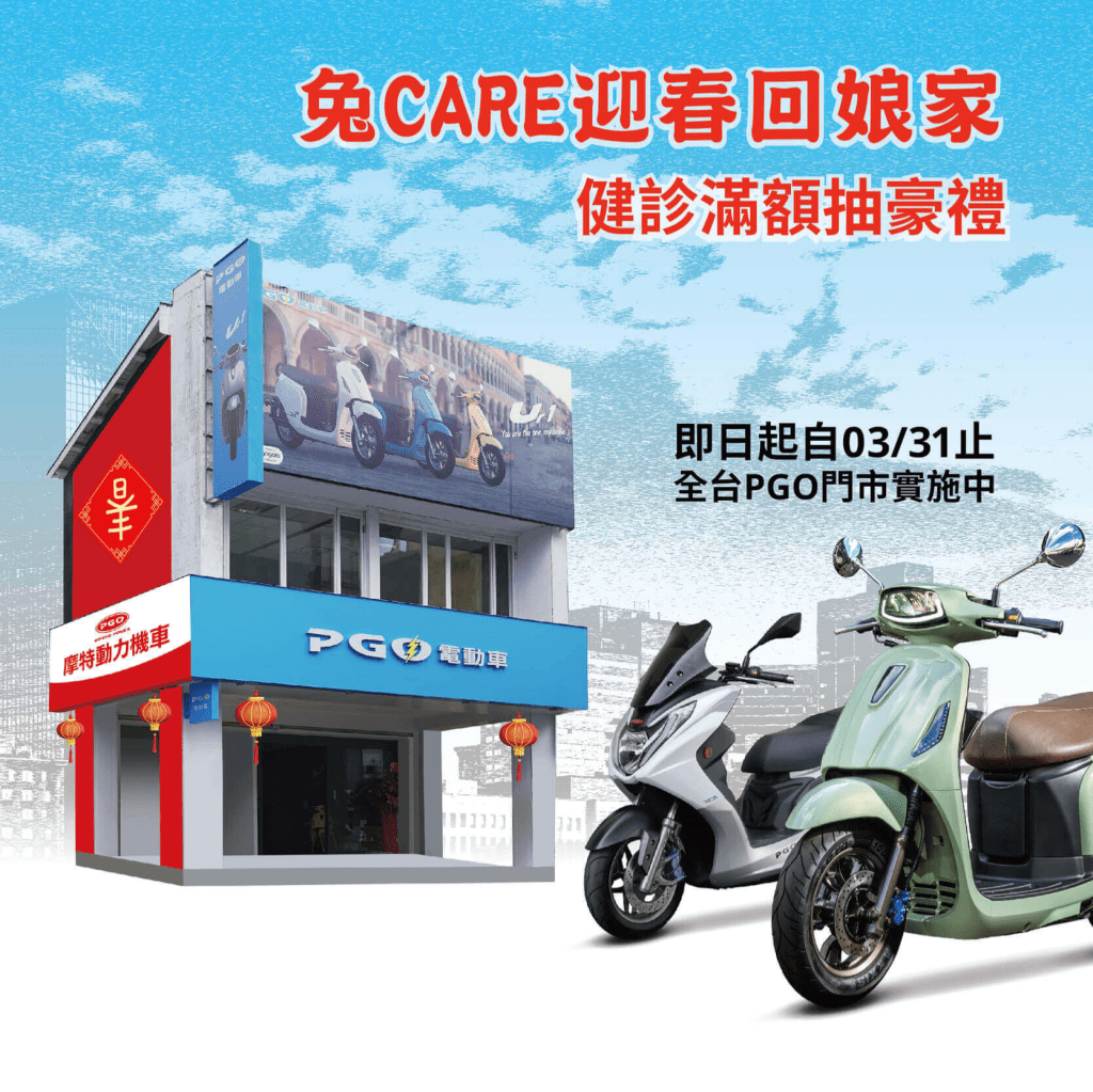 歡慶 PGO 摩特動力機車 2023年再次拿下連續 21 年榮獲經濟部台灣精品獎的殊榮,全台超過 3000 家合作車行一同在 2023 年第一季,共同舉辦 PGO 兔 CARE 迎春回娘家活動,自即日起至 2023/03/31 止,藉此邀請 PGO 車友進行愛車健診,還有 5000元購車金以及多項豪禮加碼抽,千萬別錯過囉!