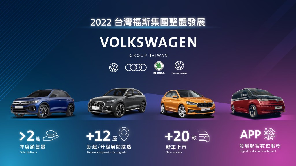 台灣福斯集團(Volkswagen Group Taiwan) 自2015年成立以來已邁入第8個年頭,旗下由四大品牌「台灣奧迪、台灣福斯汽車、Škoda Taiwan 及台灣福斯商旅」組成,透過豐富產品陣線、顧客服務、車主活動等多元化面向為台灣市場帶來完整、創新的品牌體驗。雖然面臨大環境多方挑戰,感謝全體集團同仁與經銷夥伴們的齊心努力以及車主及消費者的青睞與支持,2022年台灣福斯集團整體銷售表現穩健,創造年度銷售達 22,687 輛的佳績。