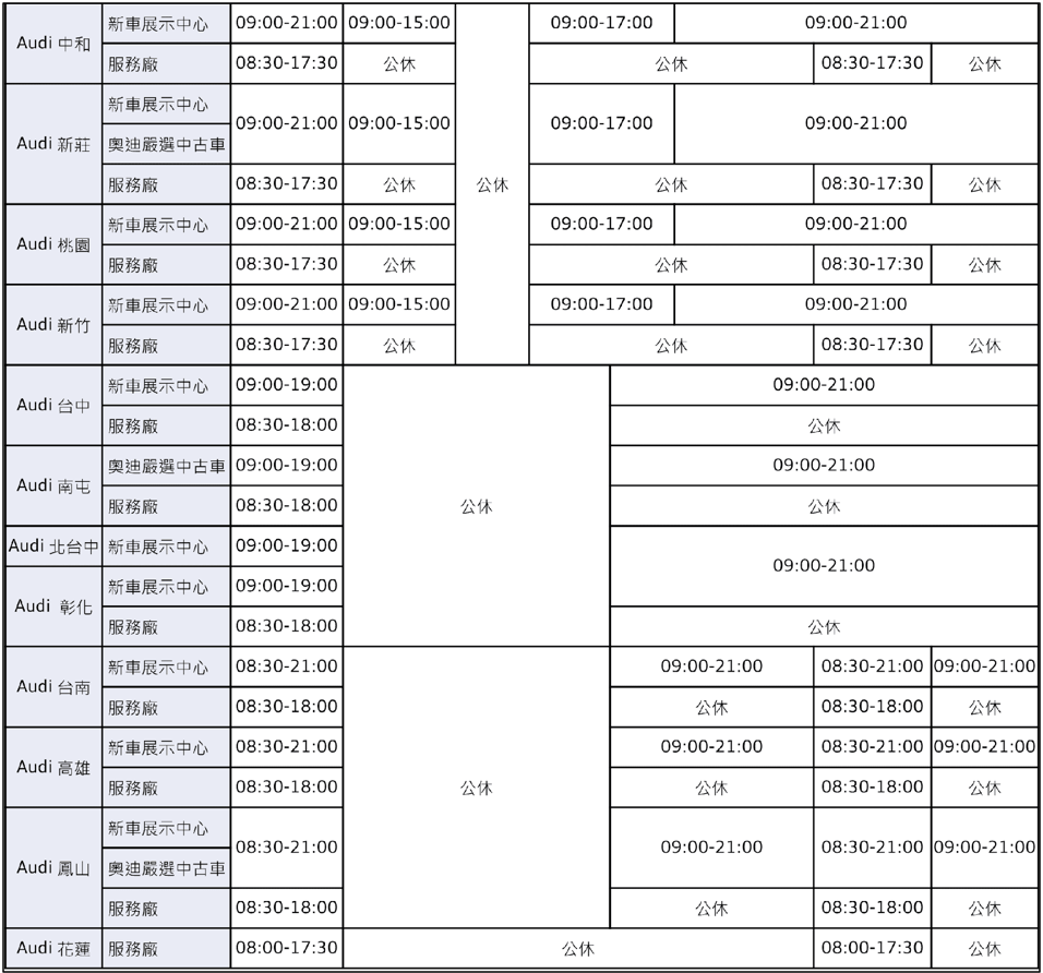 浮浪新聞 【浮浪新聞】2023 Audi 經銷據點春節期間營業時間 Date: 2023 年 1 月 16 日Author: 劉建宏 0 留言 台灣奧迪預祝各位車主新年快樂!春節期間,敬請留意各展示中心、服務廠營業時間。祝福大家揚眉兔氣,兔年行大運!Audi 全台授權經銷據點包含新車展示中心、奧迪嚴選中古車及服務廠等將於農曆春節期間調整營業時間,1月30日(一)起恢復正常營業。全台各據點詳細營業時間敬請參考以下資訊或Audi官方網站,如遇緊急情況請洽詢Audi 24小時服務專線 0809-092-834。 台灣奧迪全台授權經銷據點2023農曆春節營業時間: 分享此文: 分享到 X(在新視窗中開啟) X 分享到 Facebook(在新視窗中開啟) Facebook 喜歡 正在載入... 相關