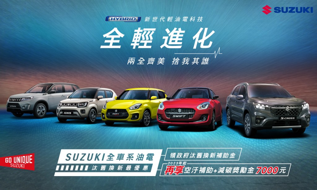 TAIWAN SUZUKI延續新春喜氣,就是要讓您優惠享不停!為了讓車主在新的一年有好的開始,TAIWAN SUZUKI推出各車款多重好禮優惠:2023年起SUZUKI全車系HYBRID車款除可領政府汰舊換新補助金之外,還可再享空汙補助及減碳獎勵金7000元;VITARA及SWIFT車系領牌就贈「中油禮物卡10,000元」;IGNIS可再享丙式車體險;IGNIS及SWIFT車系購車享「首年日付60元專案」, VITARA車款購車享「60萬30期0利率」;全車系領牌可享『代車險』及『不限里程道路救援』。