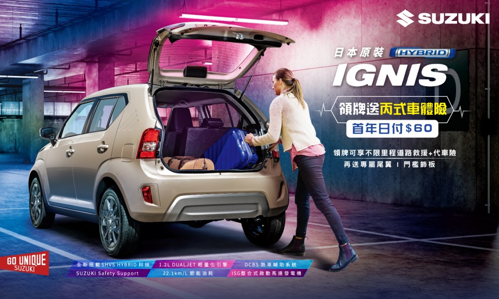 連續二年蟬聯車訊風雲獎「最佳進口都會車」的 IGNIS全新搭載 12V HYBRID 輕油電科技與 1.2L DUALJET 引擎,創造平均油耗 22.1km/L 的一級能源效率。此外,1,197cc最小級距排氣量,更造就稅金與燃油的雙效節能表現。SUZUKI Safety Support 及 DCBS 煞車輔助系統等安全科技配備打造出極智行車守護,讓車主安心穿越都市街道。經典時尚的設計,將掀背功能與 SUV 車型完美結合,車室空間以水平線延伸出遼闊舒適的視覺感受,後座採 6/4 分離式設計,隨心變化出最大 501L 收納空間。快跟 IGNIS 馭電進化,馭見生活更多可能。