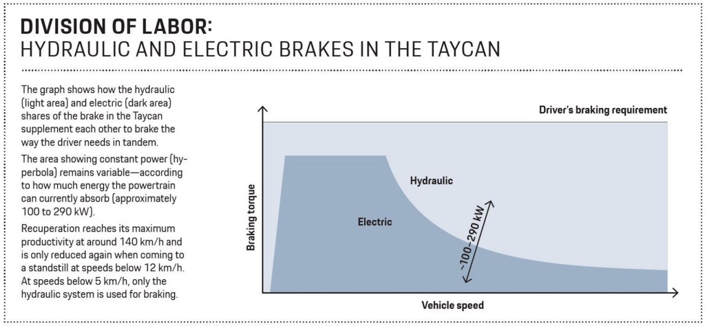 煞車力道在車上通常並非平均分配,三分之二的煞車力道由前軸輸出,剩下三分之一來自後軸;儘管Taycan 的後軸馬達較大,理論上能產生較多煞車力道並回收更多動能,但電動煞車系統中以同樣比例分配煞車力道,三分之二煞車力由前馬達提供,剩下三分之一由後馬達提供。然而,後軸馬達所保留的餘裕可以用於調整煞車力在前後軸之間的分配比例,這此情況下,為了確保駕駛穩定,必須根據情況限制後軸的最大煞車力。保時捷動能回收煞車研發整合工程師Ulli Traut解釋道:「能夠回收最多能量的電動馬達就能產生最大的煞車力道。」