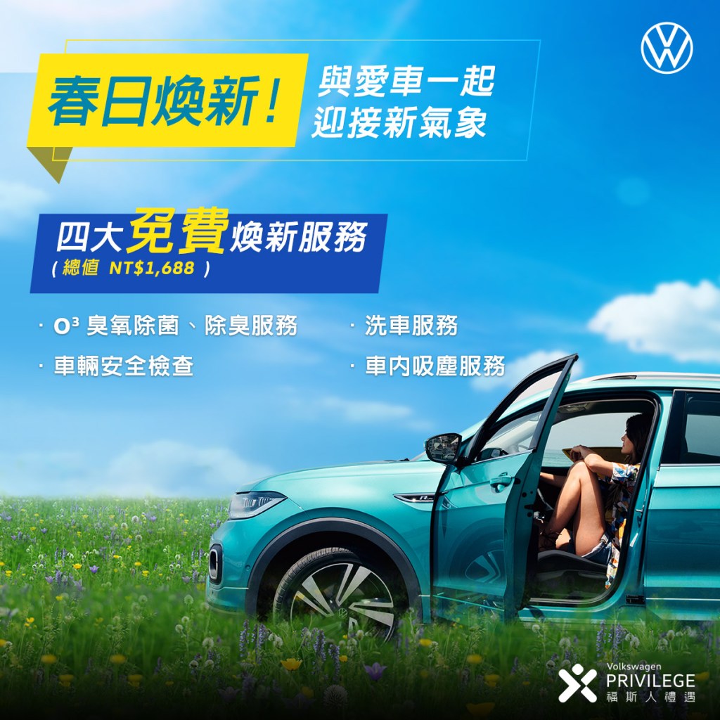 - 台灣福斯汽車推出「春季四大免費煥新服務」(總價值1,688元),包含O3臭氧除菌/除臭服務、洗車服務、車輛安全檢查以及車內吸塵服務。