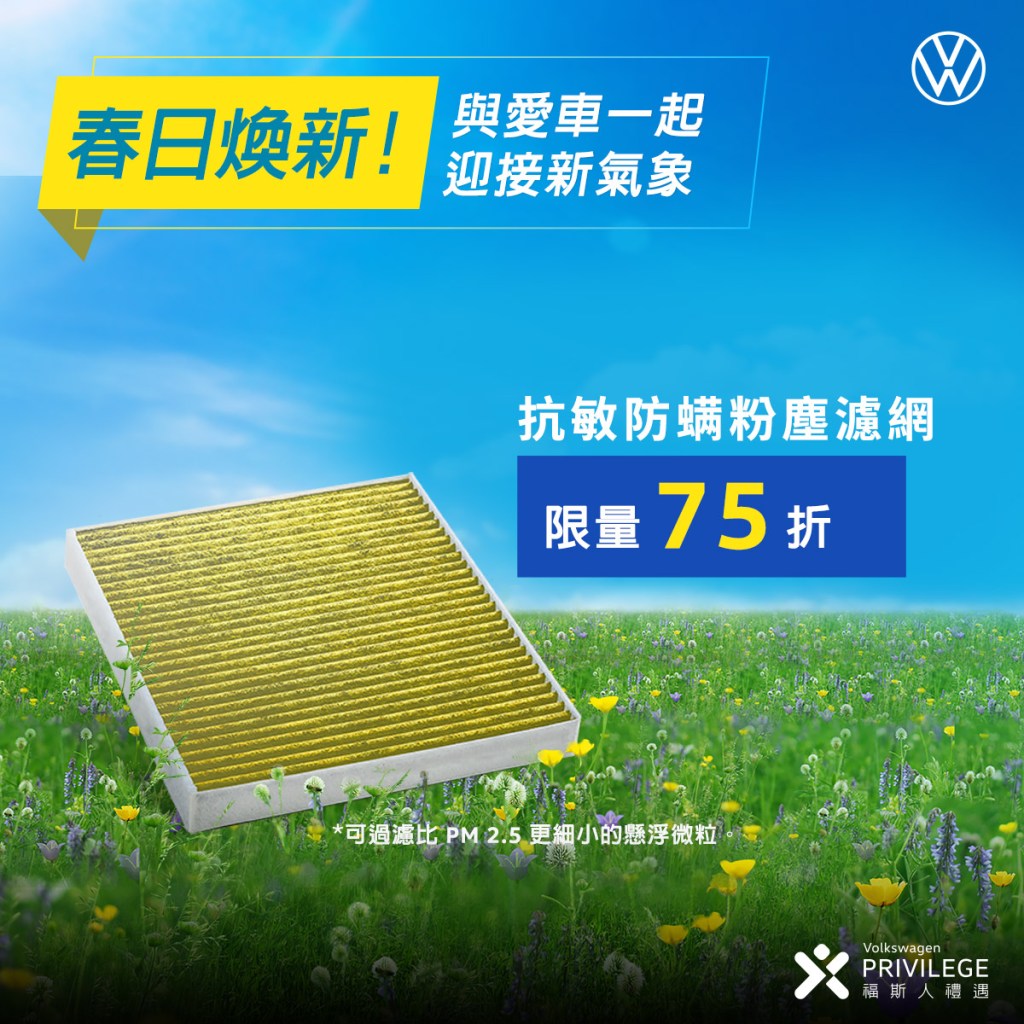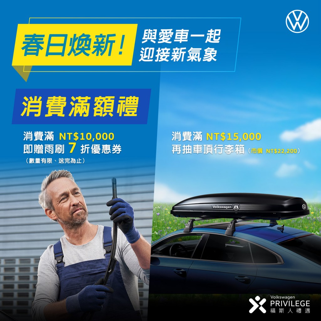 台灣福斯汽車推出「春季四大免費煥新服務」,車主可利用My Volkswagen APP線上預約回廠,專業團隊將免費為車輛進行O3臭氧除菌/除臭服務,採用專業型 O3空氣臭氧殺菌機進行全車快速淨化空氣,利用臭氧將病毒細菌氧化分解,達到殺菌除臭效果,給予良好空氣品質與潔淨車室;車輛安全檢查則有引擎、空調、輪胎和煞車等各系統檢查,貼心守護行車安全。「福斯人禮遇計畫」會員,活動期間享原廠指定保養耗材/煞車片/來令片8折起,以及原廠機油全面8折*,而抗敏防蟎粉塵濾網限量優惠75折。同時,一次自費更換四條馬牌輪胎**的車主,享其中一條免費。為回饋Volkswagen 車主,凡消費滿10,000元即贈雨刷7折優惠券(數量有限,送完為止),消費滿15,000元即可抽車頂行李箱(市價22,200元),歡迎車主即刻預約回廠,感受德系工藝。