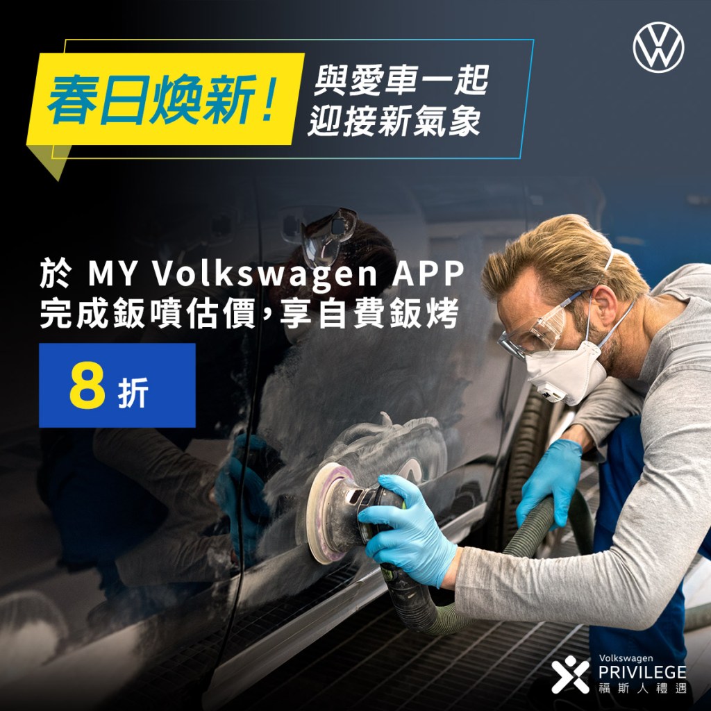 - 福斯人禮遇計畫會員,凡於My Volkswagen APP完成鈑噴估價,即可獲自費鈑烤零件(不含工資)8折之優惠。