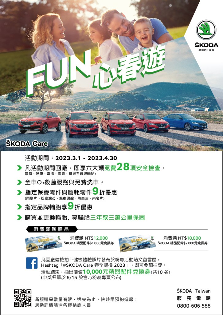 ŠKODA Care系列的2023年春季健檢正式啟動,自3月1日起至4月30日為期兩個月,本次「FUN心春遊」活動提供六大類28項免費安全檢查,只要回廠參加活動,不僅可享有指定保養零件優惠,亦有機會抽中價值新台幣10,000元的ŠKODA精品配件兌換券 (共10個名額)