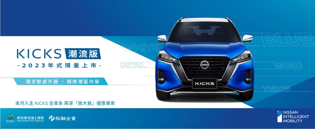 NISSAN KICKS去年10月全新改款上市以來,主打「外型、安全、便利、動力」四大升級訴求,至今年1月底累計銷售已達4,634台,穩坐小型跨界休旅冠軍(註1)。為感謝消費者的熱愛與肯定,並滿足車主追求與眾不同的個性化需求,NISSAN運用2023年式限量推出300台的「KICKS潮流版」,搭配專屬全新車色白頂狂藍,升級潮流動感外觀,包含動感擾流尾翼(註2)、酷黑17吋鋁圈及酷黑車頂架;配備精緻潮藍內裝,包含潮藍D-Shape方向盤、潮藍3D紓壓皮椅、潮藍絨毛腳踏墊及精裝壓印頭枕,外觀及內裝極具視覺特色,並標配豐富的智行安全配備,超值汰舊換新價格81.5萬元起(註3),配備升級不加價,給消費者最超值的享受。