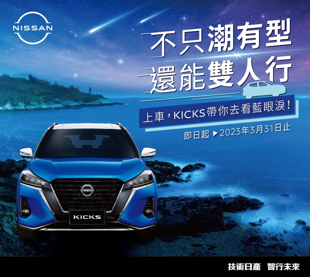 NISSAN KICKS是台灣跨界休旅的重要指標車款,NISSAN為回饋喜愛KICKS消費者的支持,將特別推出馬祖藍眼淚雙人機票抽獎活動,與消費者一同欣賞台灣季節限定的藍眼淚奇景。即日起至2023年3月31日止,凡至NISSAN全省經銷展示中心試乘KICKS,並與KICKS潮流版合照上傳社群媒體(FB/IG)公開分享,即可抽馬祖藍眼淚雙人機票,總計9名幸運得獎者可攜伴一同追淚。