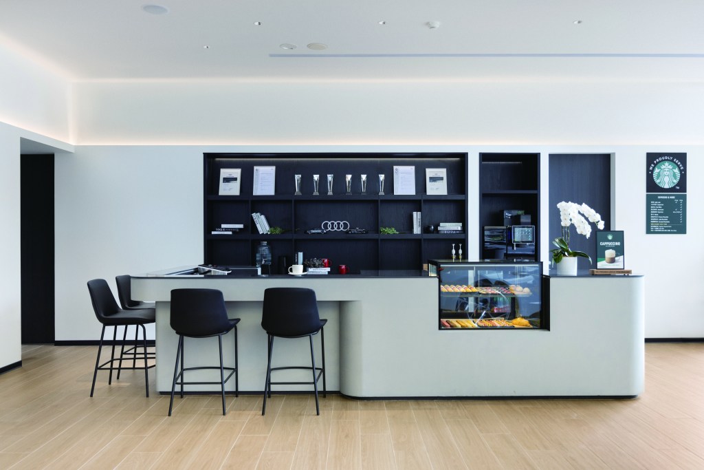 位於NEXUS數位迎賓專區後方的數位客製化專區,讓顧客透過數位系統瀏覽車輛塗裝顏色或內裝配置,加以實體色板輔助,實際觸摸感受皮革座椅或金屬飾條的質感,為愛車挑選心儀式樣。Audi南港展示中心融入Audi Progressive Retail Concept設計概念,以暖色系現代風格打造新車銷售區域,共可展示6款新車。今年,台灣奧迪導入全新據點餐飲服務標準,結合星巴克咖啡服務(We Proudly Serve Starbucks™”)和精緻餐點,經銷商服務同仁皆換上新制服,服務流程不斷持續進化,為Audi Family和所有顧客提供高品質服務。