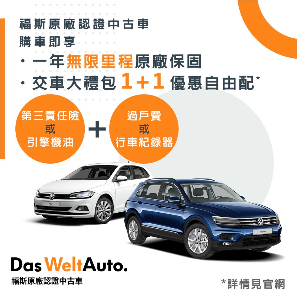 - Das WeltAuto. 福斯原廠認證中古車春季購車方案實施中,消費者購車即享「交車大禮包1+1優惠自由配」,兩區優惠各擇一,分別為汽車第三責任險或引擎機油,以及過戶費或行車紀錄器,並且再擁一年無限里程原廠保固,帶來全方位的安心保障。