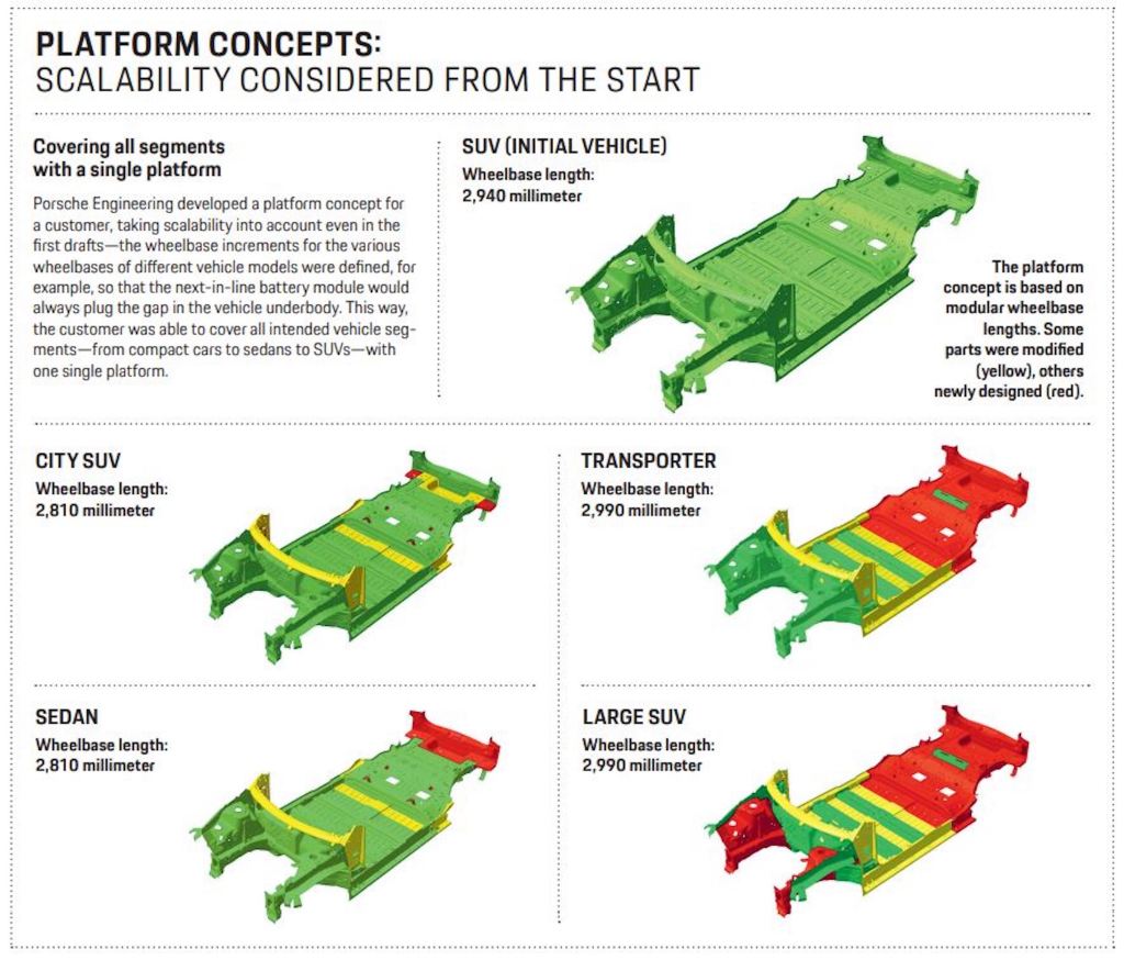 對於使用內燃機引擎作為動力的車款來說,以單一平台對應多種車型的方式已行之有年。這麼做有助於開發大量不同的車型與衍生車種,並且在合理的成本之內進行量產。在生產方面,這種作法能擴大經濟效益,大量生產更少種類的零組件不僅降低成本,也確保產品的高品質。