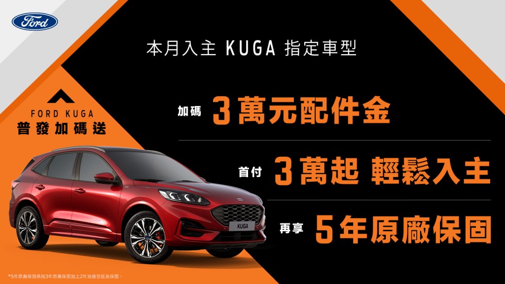 | New Ford Kuga EcoBoost®180超質X New Ford Kuga EcoBoost®180旗艦 New Ford Kuga EcoBoost®180旗艦X New Ford Kuga EcoBoost®250 ST-Line X | 2023年4月1日至4月28日止 入主即享3萬元配件金、首付3萬元起及5年原廠保固。 |