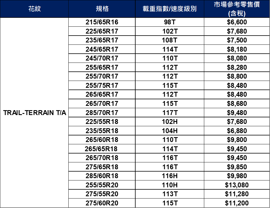 「從城市到野地」TRAIL-TERRAIN T/A® 除了能輕鬆掌控越野地形,更能提供適用於一般街道行駛的優異性能,滿足都會戶外咖日常通勤的高里程需求;高里程胎面花紋設計,有利提升行駛穩定性,延長磨耗壽命,駕馭感受再升級,展現絕佳的On-road操控性,此外,創新設計的抗切割膠料,更能大幅提升路面抵抗力,無論戶外出遊、城市通勤都更安心穩定,優異性能「Go馳久」。