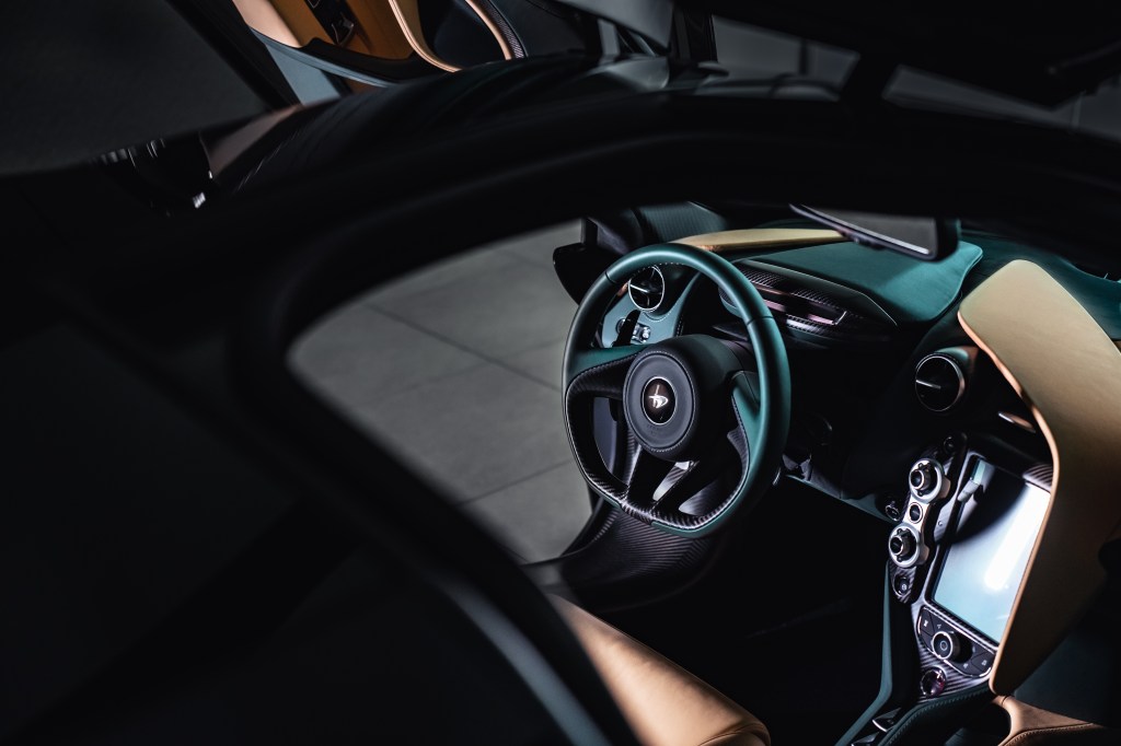 車室內利用Ivory 及Dark Green 的對比色客製化皮革內裝,營造內斂奢華氛圍,選配碳纖維內裝套件及加大型碳纖維賽車桶椅,與McLaren F1 XPGT相同的MSO 客製化Daytona 風格座椅,使用Dark Green特殊色縫線貫穿座艙空間,專屬銘牌刻有『Inspired by F1 XPGT』,在在顯示台灣限定原生經典特仕版的獨特性與雋永歷史,呼應McLaren不忘初衷,致力打造領先世代的絕佳車款。