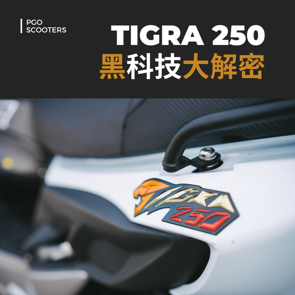 PGO TIGRA 250 黃牌入門車款承襲 PGO 產品一貫的優異性能,搭載全新開發的DOHC水冷新動力,這顆高科技雙凸輪軸最強水冷心臟,極致與完美帶給騎乘者超乎馭想的全新感受,媒體將之譽為“黃牌小鋼砲”。