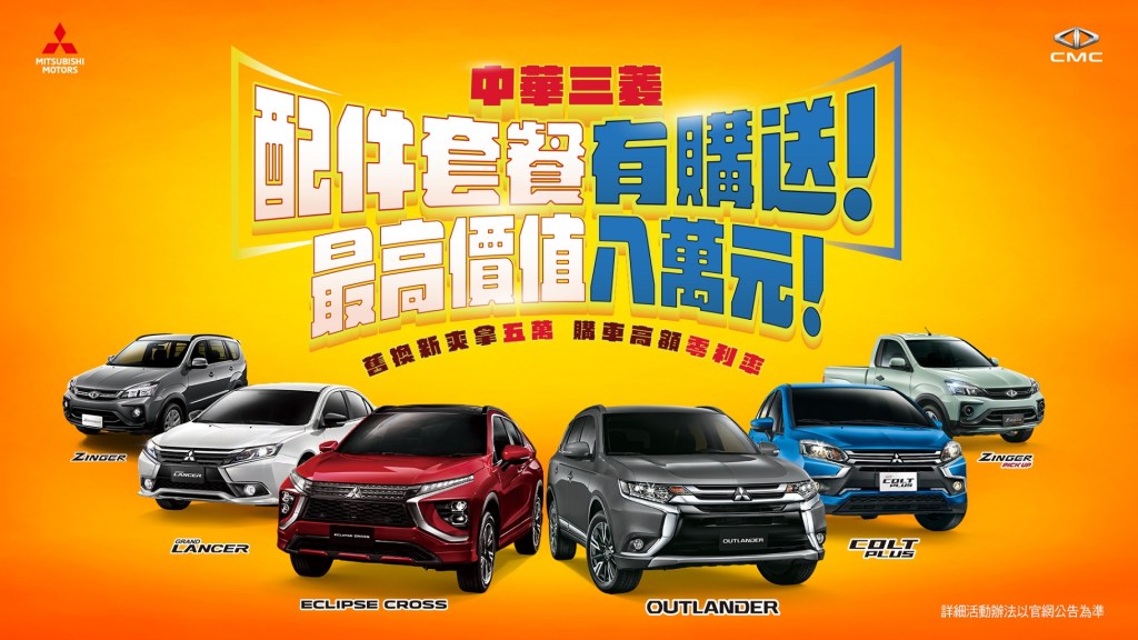 換車就趁現在!!!中華三菱推出「三菱配件套餐有購送!」購車優惠活動,凡於本月下訂指定車款COLT PLUS、GRAND LANCER、OUTLANDER、ZINGER、ZINGER PICKUP、ECLIPSE CROSS並完成領牌程序,即可獲得最高價值80,000元之配件套餐精選優惠。此外,本月於三菱汽車官方網站登記預約試乘/賞車/購車諮詢,並至全台中華三菱展示中心採用掃描QR CODE方式報到,即可獲得7-11 50元電子禮券一份(名額有限,發完為止),加碼再抽最高300元迪卡儂禮券。