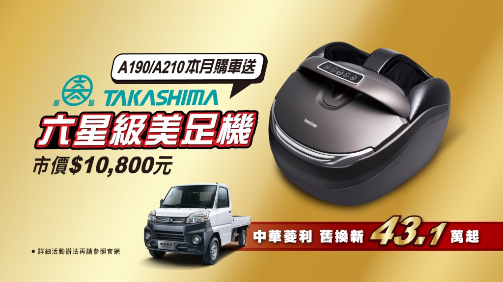 而想買菱利汽油版本A180/A190/A210的朋友也有優惠好康,除贈送5年或15萬公里「大心」延長保固(市價最高14,000元)外,還有18萬12期0利率優惠,本月購買A190/A210,再送高島六星級美足機(市價10,800元),數量有限送完為止。欲知更多詳情請洽全省中華三菱經銷商或或至官網了解更多訊息。