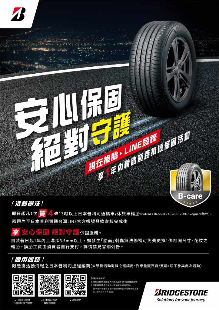為持續向消費者兌現普利司通的E8承諾(註1),日本普利司通秉承「以最高品質貢獻社會」的使命,不斷擴大並發展業務,以滿足社會不斷變化的需求,並繼續支持每一個人的移動與生活方式。為了迎接夏季旅遊旺季,守護所有車主的安全旅途,日本普利司通領先業界提供路損保固「安心保固 絕對守護」,即日起凡1次購買4條13吋以上日本普利司通轎車/休旅車輪胎(註2),兩周內至日本普利司通LINE完成登錄,一年內不限里程且殘餘溝深3.5mm以上,經判定輪胎受道路損壞無法修補,即免費享換新服務,詳情請洽日本普利司通官網https://www.bridgestone.com.tw/zh。