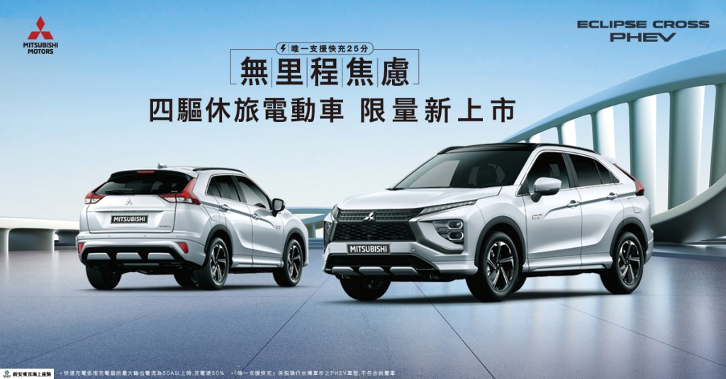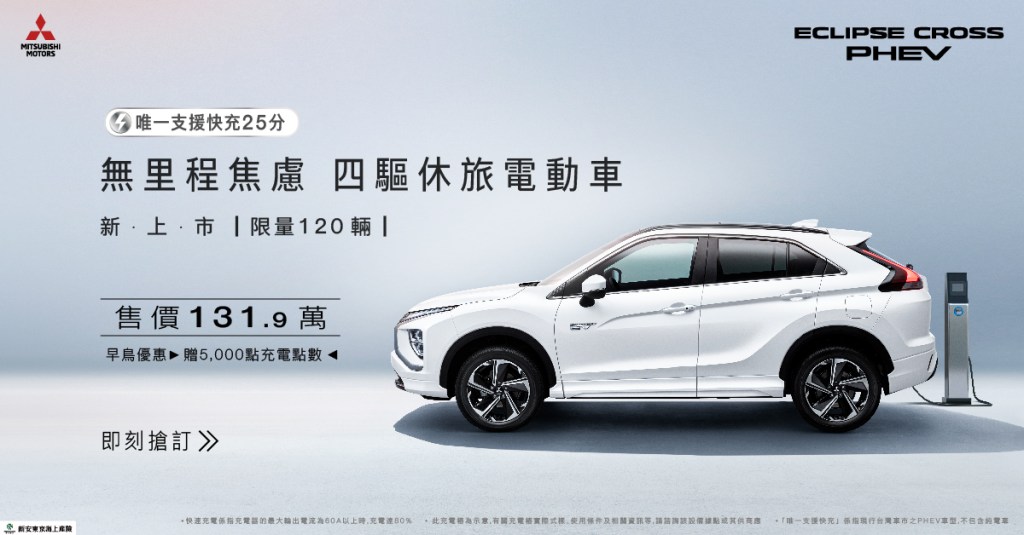 日本熱銷的PHEV 休旅車-Mitsubishi Eclipse Cross PHEV正式在台推出,具備完整電能驅動與引擎驅動兩套動力系統,擁有加速快、車室寧靜、純電行駛等環境友善新能源車優勢,當電力不足時,可切換為油電模式繼續行駛;還可以支援快充,只要25分鐘即可充滿電力達80%,是台灣車市中唯一支援快充的PHEV車型,真正讓車主享受電動車優勢,又可擺脫里程焦慮!即刻入主Mitsubishi Eclipse Cross PHEV 只要131.9萬,限量120台,6/30前早鳥下單優惠還可再享充電點數5,000點!