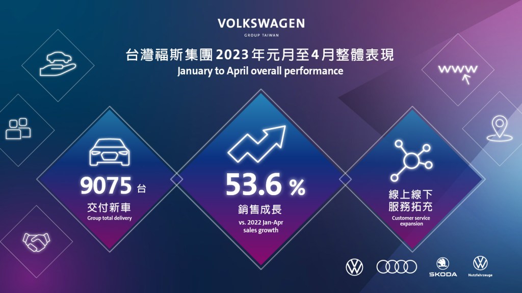 - 台灣福斯集團 2023 年元月至 4 月整體銷售量暢旺,較去年同期成長 53.6%。