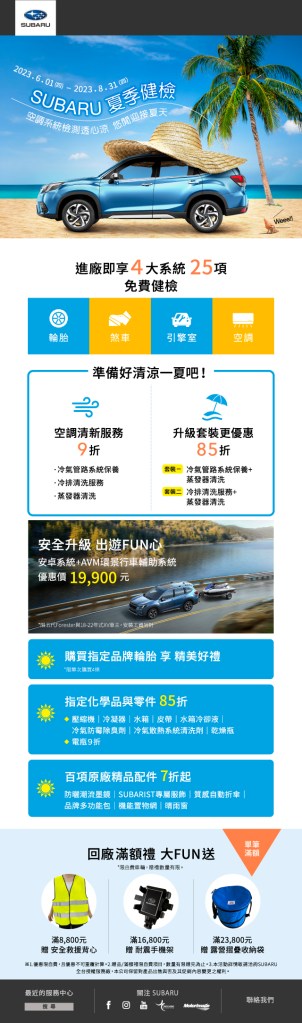 炎熱的仲夏時節即將到來,為車主愜意享受每一趟美好夏日旅遊,SUBARU貼心規劃「2023 SUBARU夏季健檢」,提供四大系統免費健檢,以及系列超值保養優惠,讓愛車都能以最佳車況陪伴車主迎接夏天到來,盡情和家人享受今夏的精采。