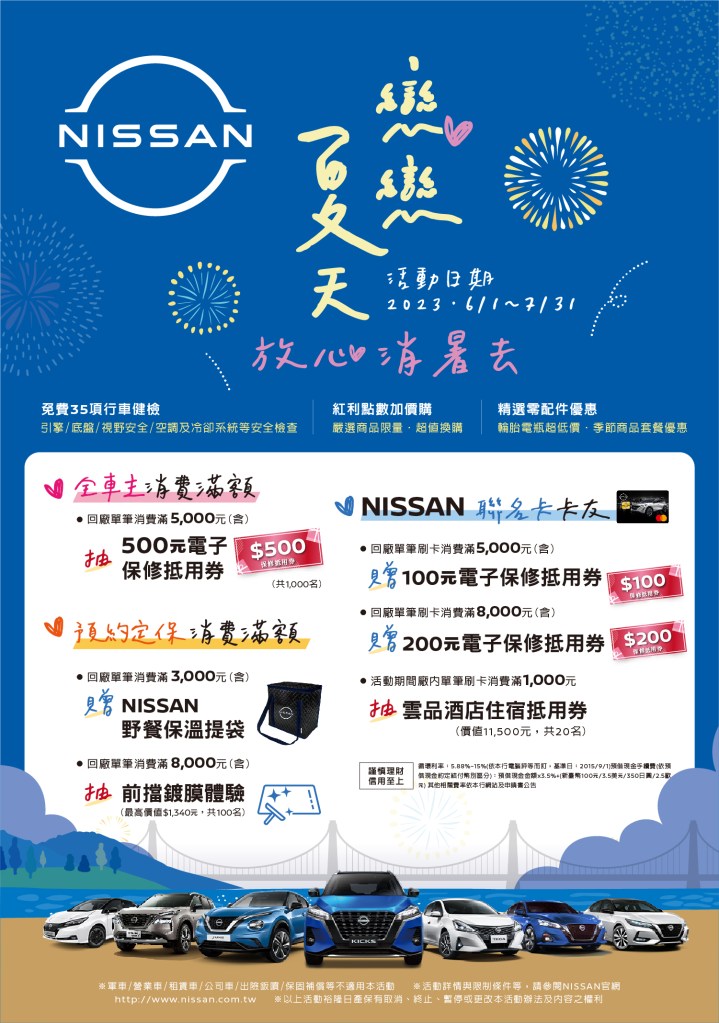 註:2023年裕隆日產汽車(下稱NISSAN) 「戀戀夏天 放心消暑去」 行車健檢活動說明: