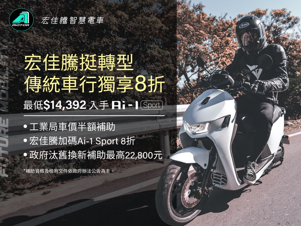 為配合經濟部工業局推動一般機車行轉型電動車行相關計畫,並協助推動綠色交通運輸發展,宏佳騰智慧電車針對有意轉型的傳統車行提供加碼補助計畫。業者只要完成由經濟部舉辦的機車行升級轉型輔導-機車維修訓練第一階段課程,並獲得結訓證書,即可獲工業局補助半額購買電動機車,補助上限最高可達6萬元。同時宏佳騰針對最熱銷電車款Ai-1 Sport提供8折購車優惠,搭配政府汰舊換新補助最高22,800元,能以最低不到15,000元的價格入手,歡迎有興趣的業者聯繫全台宏佳騰智慧門市。