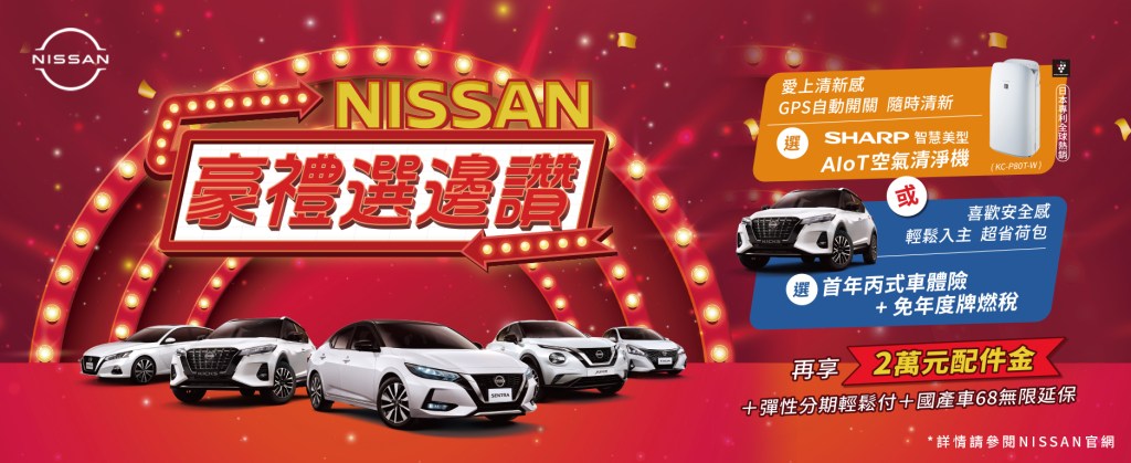 - 若選擇「SHARP 智慧美型AIoT空氣清淨機」(型號KC-P80T-W),於交車時可獲得SHARP 智慧美型AIoT空氣清淨機(型號KC-P80T-W)乙台,數量有限,敬請把握。領取方式:交車時NISSAN經銷公司將親送SHARP 智慧美型AIoT空氣清淨機(型號KC-P80T-W),贈品以實物為準,恕不接受更換或折抵現金或找零,NISSAN保留更換贈品之權利。本贈品之相關說明請參考台灣夏普官網,贈品若有任何疑問請逕洽台灣夏普客服專線0809-090-510,NISSAN不負任何贈品瑕疵擔保及保固、維護責任。