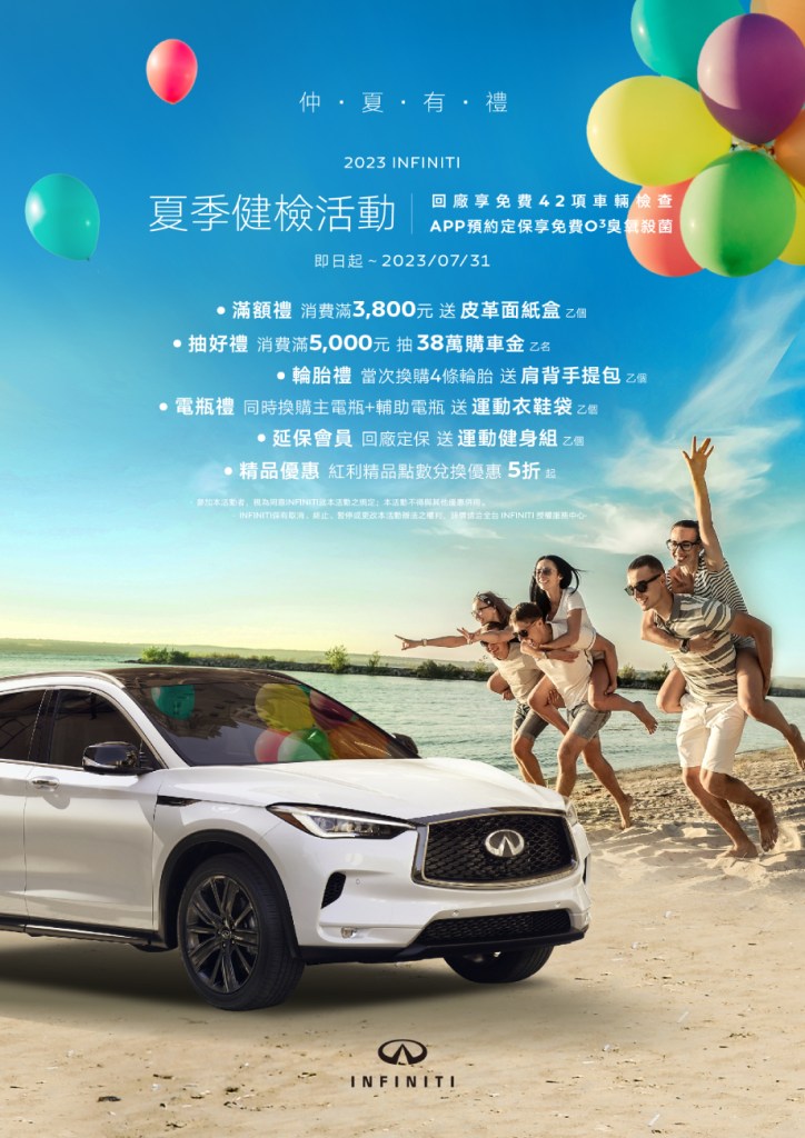迎接盛夏假期,INFINITI TAIWAN提醒車主,出遊前務必檢查車輛狀況確保行車安全,自即日起至2023年7月31日止,展開「2023 INFINITI夏季健檢活動」。活動期間回廠即享免費42項車輛檢查,再享仲夏有禮方案,包含抽頭獎「38萬元購車金」、滿額禮、輪胎禮、電瓶禮及紅利精品點數兌換5折起等多項優惠好禮,APP預約定保更享免費O3臭氧殺菌,延長保固會員回廠定保再贈「運動健身組」禮盒乙個。敬邀INFINITI車主回廠為愛車進行全面檢視與保養,讓夏日出遊做好萬全準備。(註1)