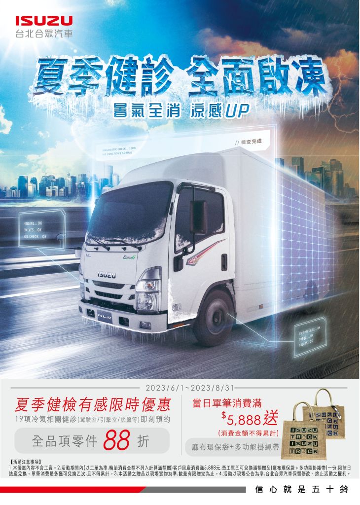 炎熱酷暑已到,ISUZU台北合眾汽車 「夏季健診、全面啟凍」活動自6月1日起至8月31日,提供19項行車安全、冷氣相關免費健檢,全品項零件88折優惠,單筆消費滿額贈送精美麻布環保袋乙組。