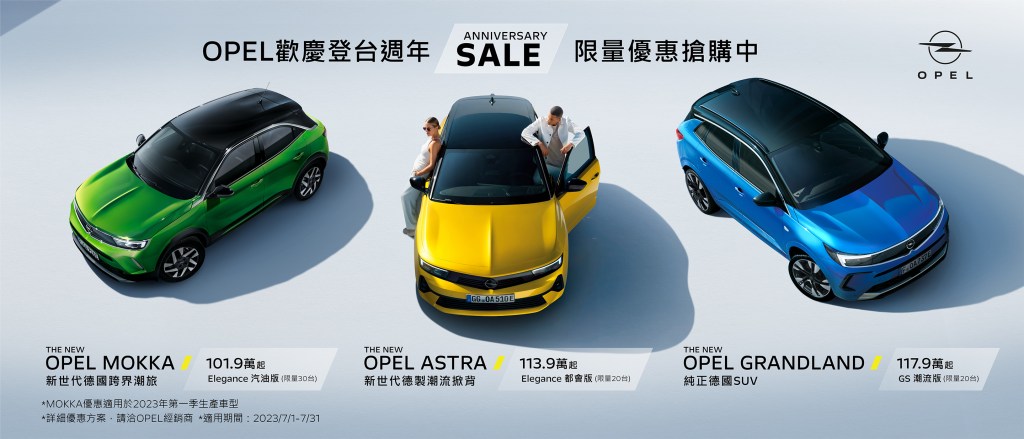 OPEL台灣總代理 歐吉汽車歡慶成立週年,這一年裡,歐吉汽車落實深耕台灣的承諾,完成新北、台中、台南以及高雄等四大旗艦點開幕,接下來到年底還會有濱江服務廠、內湖展示點、 桃園以及北台中旗艦店的開幕,全力完善通路佈建,提供消費者舒適、便利的全方位體驗。同時加快速度導入OPEL最新世代車款,以齊全的產品線滿足台灣消費者的多元需求。為了回饋消費者的支持,即日起至7月31日止,OPEL台灣總代理 歐吉汽車推出全車系限量優惠價專案,以最大的誠意回饋喜愛OPEL的車迷朋友們。