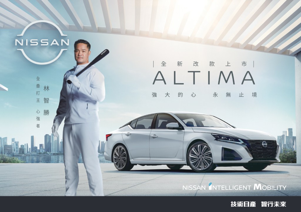 NISSAN ALTIMA一直以來以「強悍動能」及「全方位豐富配備」廣受消費者支持與好評,裕隆日產特別邀請現役中華職棒全壘打王「林智勝」擔任NISSAN ALTIMA全新改款證言人,兼具強力打擊實力及全方位運動表現,展現NISSAN ALTIMA「起心動念 皆為我所馭」旗艦房車傳奇定位。