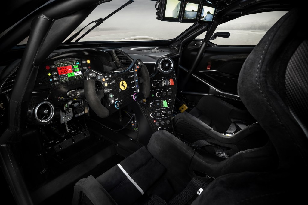 新車座艙採用精簡的設計理念,與Ferrari 488 GT3 Evo 2020賽車的內裝造型相似,僅乘客座側面的門板和儀錶板飾板有所不同。此外,Ferrari KC23的專屬座椅採用Alcantara®材質,並配上電焊工藝的標誌,賦予座艙的優雅韻味,與外觀風格完美呼應。新車配備攝影鏡頭,提供優異的後方視野。同時,取消傳統的後視鏡後,車身側翼線條更顯簡潔流暢,並有助於提升車輛的空氣力學性能。