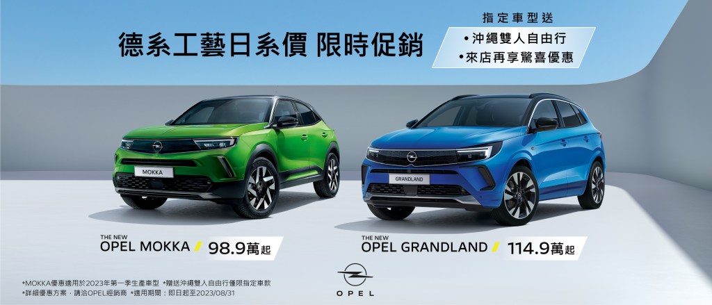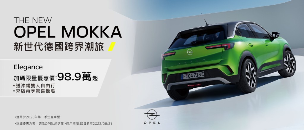 - 7/1 (六) – 7/31 (一) 推出展間試乘活動,活動期間至 OPEL 展示中心或品牌體驗館預約試乘任一車型並留下資料,即可獲得限量「OPEL 都會極簡墨黑提袋」。