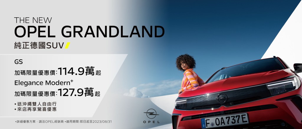 - Grandland GS 加碼限量優惠價 114.9 萬元,入主加贈手機無線充電配備;