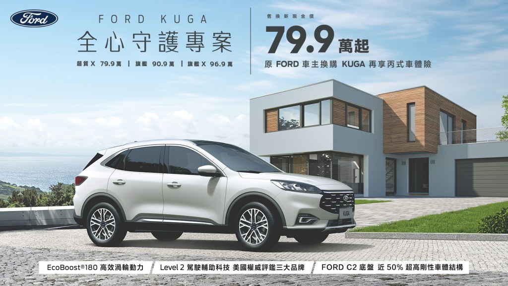 | New Ford Kuga | 2023年8月1日至8月31日止 New Ford Kuga指定車型「全心守護」專案 包含舊換新現金價EcoBoost®180超質X車型 79.9萬元、旗艦車型90.9萬元、旗艦X車型 96.9萬元、EcoBoost®250 ST-Line X車型109.9萬元 原Ford車主換購Kuga全車系贈首年丙式車體險 |