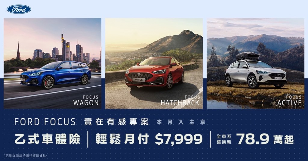 | New Ford Focus全車系 (進口車型除外) | 2023年8月3日至8月31日止 New Ford Focus全車系「實在有感」專案 入主享乙式車體險,月付7,999元輕鬆開回家 |