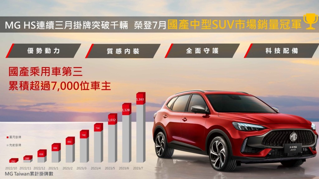 MG品牌登台滿一週年市場便捎來喜訊,當家休旅HS憑藉著「超規滿配」的產品競爭力,不僅佳評如潮深獲消費者認同,在7月份銷售掛牌成績出爐後,MG HS不僅以1,163輛寫下品牌單月掛牌新高佳績,同時也累積超過7,000位車主,而近三個月屢創新高突破千台的優異表現,更一舉帶領HS車系搶進國內汽車全市場上半年銷售前十名,更重要的是,MG HS僅花不到一年時間,除了7月份擠進國產乘用車市場銷量第三名,更續創高峰榮登7月份「國產中型SUV」單月銷量冠軍,進一步驗證MG HS車系全方位卓越超群的產品戰力!