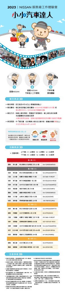 為慶祝裕隆日產汽車成立20週年,回饋廣大NISSAN車主的支持,並持續推廣兒童汽車知識體驗活動,2023年特別擴大舉辦「NISSAN 小小汽車達人」服務廠工作體驗營活動(註1),將於8月6日、8月13日、9月10日及9月17日分別在全台18個NISSAN服務廠展開活動,全台共計400個名額,車主自即日起至9月15日止可於NISSAN官網線上報名。
