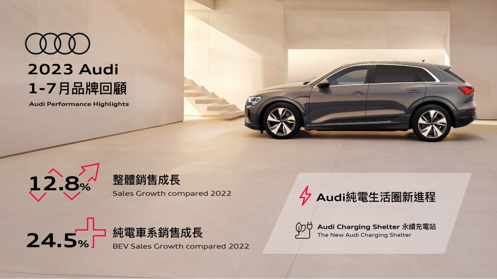 台灣奧迪2023上半年度銷售再創佳績,截至7月底為止相較去年同期成長達12.8%;其中尤以e-tron系列銷售表現突出,較去年同期成長24.5%,甫於7月上市之Audi Q8 e-tron車系預售吸引過百張訂單,為整體銷售注入新動能。