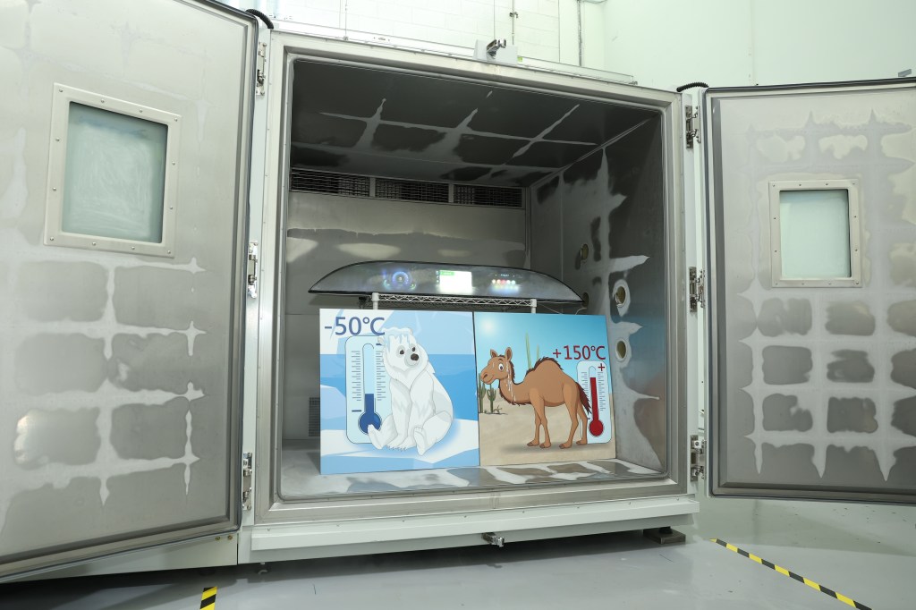 當車艙空間的需求不再只有影音娛樂,智慧座艙由8吋的小型面板,演變從駕駛座延伸至副駕空間的55吋一體式面板,內容搭載的軟體進化有ADAS輔助系統,諸如盲點偵測、車道偏移、自動跟車等,並設置導航、互動影音娛樂,當設計開發相關的電子產品時,是否能夠承受長時間的曝曬、或是零下低溫的寒冷環境、甚至是大量粉塵的侵襲等,車輛中心的高變率環境溫溼度模擬系統設備、及大型溫度衝擊環境模擬系統設備,可於20分鐘內,在零下50度C至150度C之間做升溫或降溫的環境衝擊測試,以助廠商檢視產品內部電路板的耐受品質,或進行高變率的結露模擬,評估產品組裝的氣密特性。