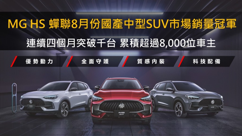 MG品牌全新生力軍ZS旗艦版盛大發表後,市場再度傳來好消息,MG當家休旅HS憑藉著「超規滿配」的產品競爭力,不畏民俗月效應持續衝刺,在8月份以銷售掛牌1,077輛的佳績,蟬聯國產中型SUV市場銷量冠軍!同時連續四個月突破千台的亮眼表現,不僅帶動MG品牌迅速在台灣累積超過8,000名車主,更驗證MG HS車系憑藉著充沛動力輸出、高質感內裝鋪陳、新穎的科技配備與 Level 2智慧駕駛輔助系統四大優勢,在銷售市場上佳評如潮且備受青睞!