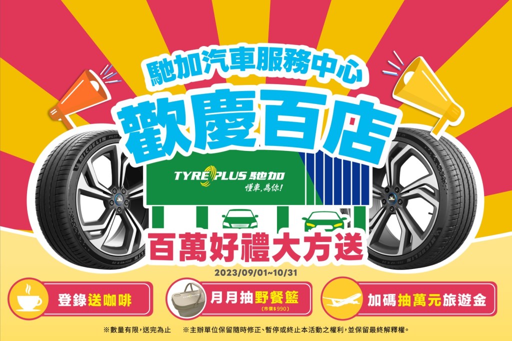 為了慶祝「TYREPLUS馳加」導入台灣第15周年、達成百店門市里程碑,馳加汽車服務中心推出超值好康優惠,即日起至2023年10月31日於全台馳加汽車服務中心購買並安裝(含電商)四條15吋以上米其林輪胎(不含輕卡胎),並於台灣米其林輪胎LINE官方帳號完成登錄,即可享超值三重好禮,除了登錄即可輕鬆獲得限量12,000杯的7-11中杯美式咖啡 (冰熱皆可)、限量抽4,800份「馳加饗食光野餐籃」外,再加碼祭出雄獅萬元旅遊金50名,總獎項數量超過16,000份,總價值突破600萬元新台幣,敬邀消費者一同歡慶馳加新里程碑。