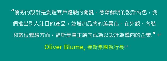 『優秀的設計是創造客戶體驗的關鍵。憑藉鮮明的設計特色,我們推出引人注目的產品,並增加品牌的差異化。在外觀、內裝和數位體驗方面。福斯集團正朝向成為以設計為導向的企業』。