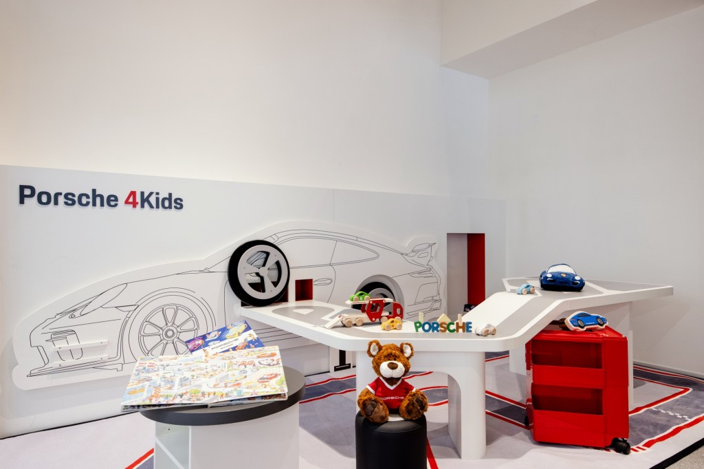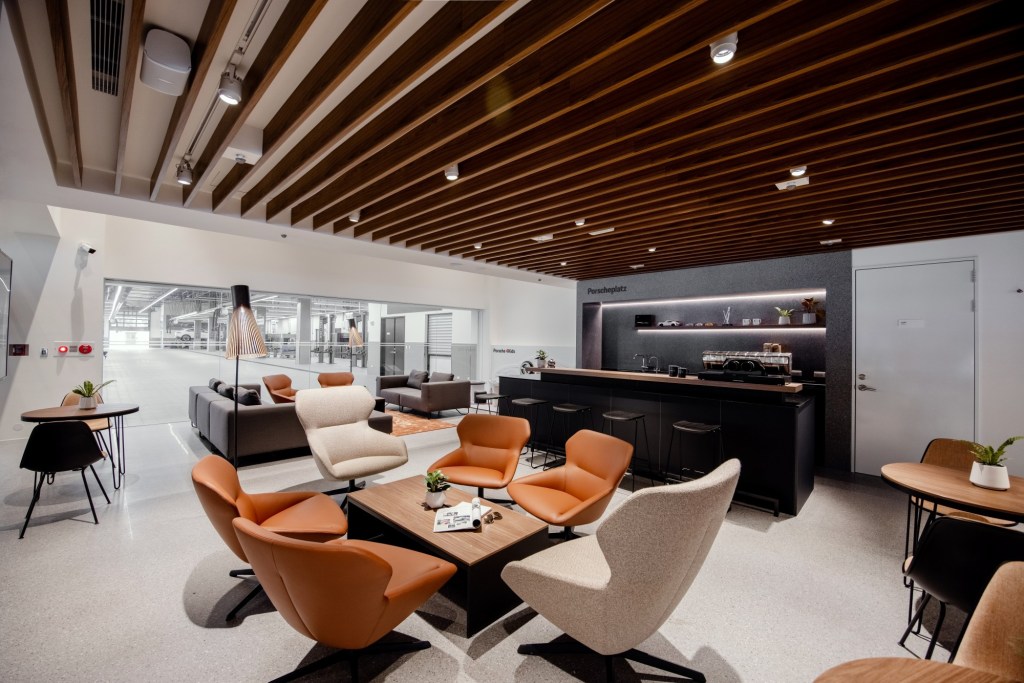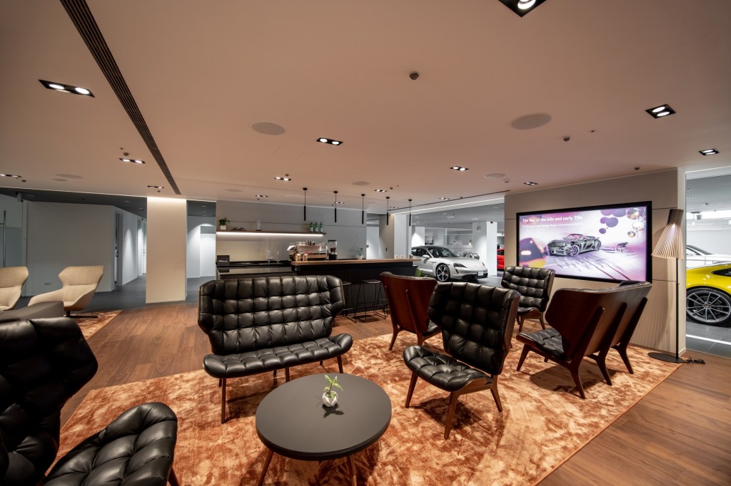 開放式的展示空間內陳列展示了多部保時捷車款,採用的鋁製 LED 燈具完美結合了金屬與木質裝飾,呈現開放的「Racing Line」設計風格。此外,台中保時捷中心的整體規劃強調高科技數位化與個人化設計,提供顧客沉浸式的品牌體驗,以滿足隨時變化的客戶需求。前衛的鋁合金外牆上設有 635 吋戶外 LED 牆,絢麗吸睛;寬大的玻璃帷幕則讓一塵不染的維修區一覽無遺,車主能隨時看到愛車維修的過程。台中保時捷中心提供車迷及車主賓至如歸的體驗,也為所有來訪的車迷提供互相交流、激勵和分享熱情與夢想的空間。