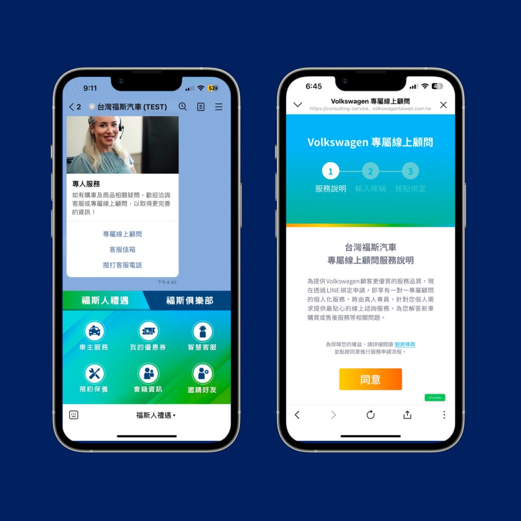 Volkswagen 持續以頂尖產品實力驚艷車壇,更致力提供貼心服務,享受充滿活力和無縫隙的品牌體驗,整合個人化數位服務,於官方LINE帳號推出「Volkswagen 專屬線上顧問」,消費者可點選「智慧客服」進入「聯絡我們」中「線上專屬顧問」選項,再點擊「新車購車」或「售後服務」,即可進入主畫面。消費者首次綁定所屬或兩間以上展示中心,便能進入諮詢室畫面,透過線上與銷售顧問互動,即可獲得24小時內專人回應。