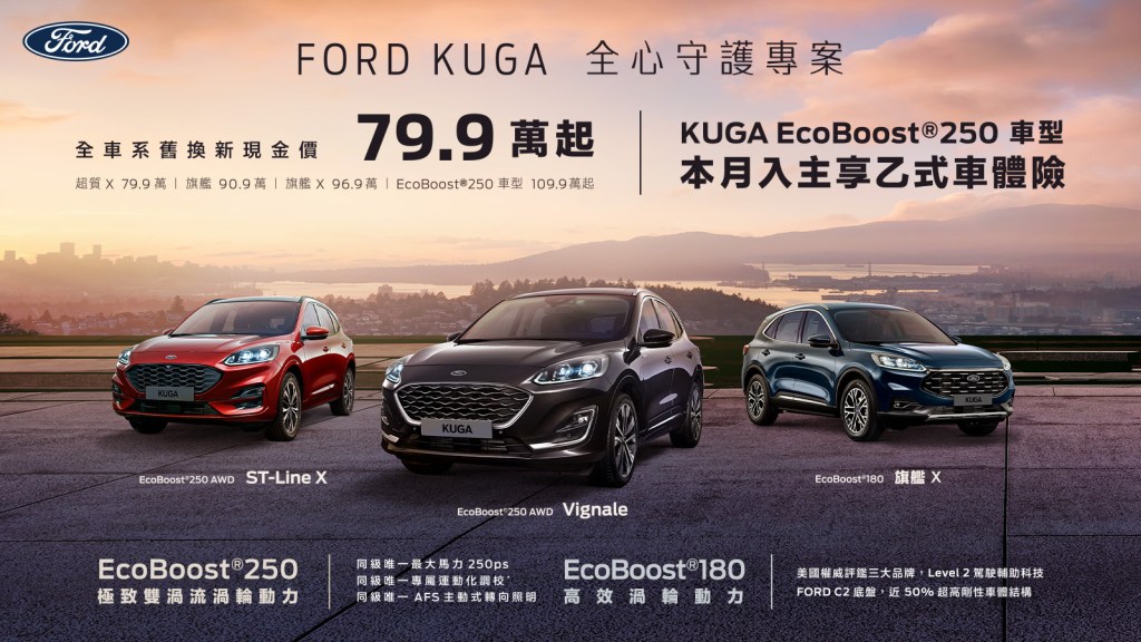 | New Ford Kuga全車系 | 2023年10月1日至10月31日止推出「全心守護專案」 EcoBoost®180車型舊換新現金價:超質X車型79.9萬元、旗艦車型90.9萬元、旗艦X車型 96.9萬元 EcoBoost®250車型舊換新現金價109.9萬起,再享首年乙式車體險 |