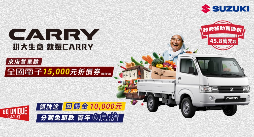6.CARRY萬元回饋金為購車後選購車用配備時抵用,上限為$10,000元,回饋金限當車當次購買抵用,不得要求領取現金或折抵其他規費及保險等費用,實際交易價格由買賣雙方各自依交易條件議定之,詳情請洽各大經銷商。