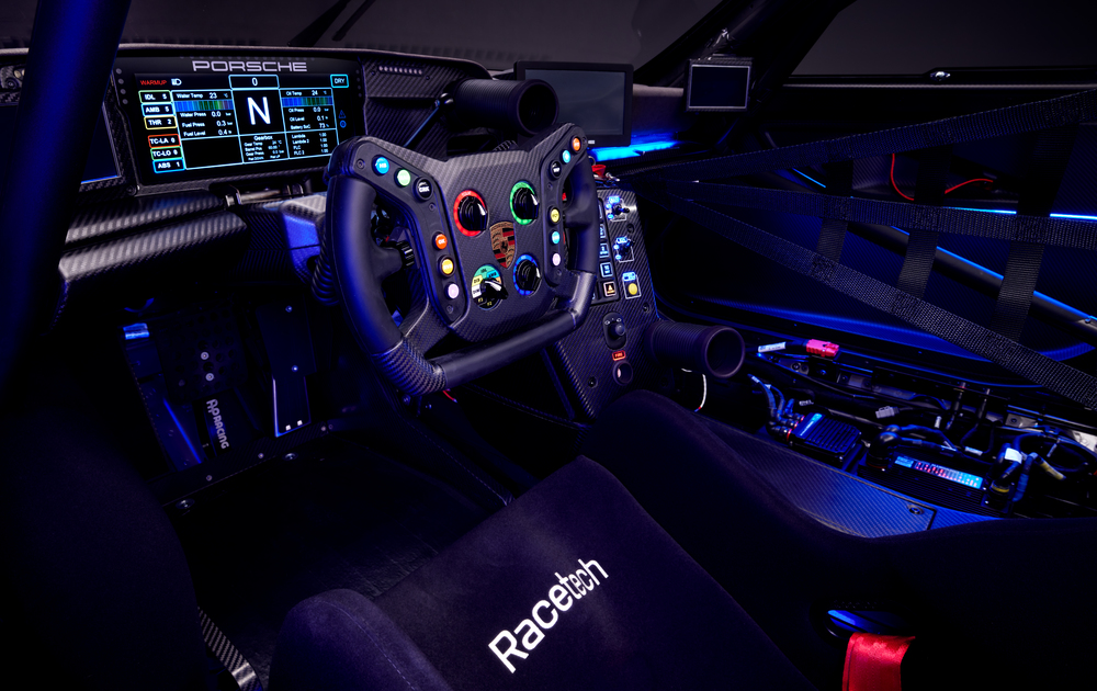 911 GT3 R rennsport 的特殊設計也顯現在微調後的內裝上,用於顯示兩具安裝在葉子板鏡頭畫面的螢幕和諧地融入座艙兩側,中控螢幕啟動畫面的特殊圖樣以及儀錶台上的限量編號都有著這輛賽車的剪影作為妝點,座艙內的氛圍照明燈還會隨著顏色可調的頭燈變換主題。所有的安全功能都符合 FIA 標準規範,堅實的防滾架只允許安裝駕駛座椅,因此就如同全球正在使用的 911 GT3 R,rennsport 限量版本也是一款單座賽車。