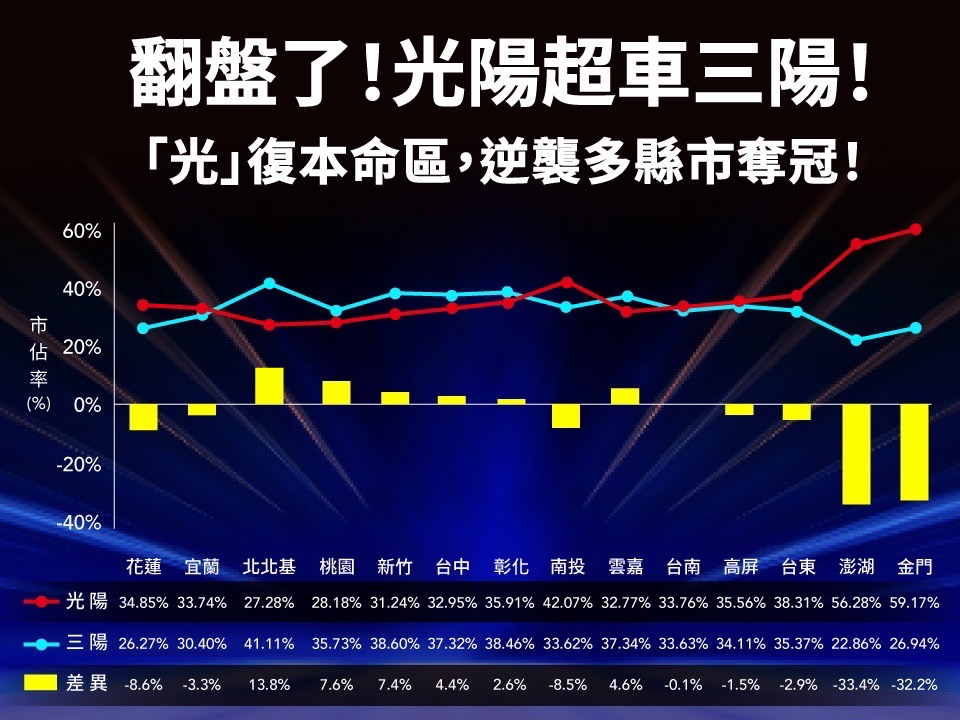 照各機種別來看,KYMCO和SYM的銷售以國民車、時尚車和女性車為主力,皆佔全系列機種七成以上,但八月和九月SYM的國民車因KYMCO投下重彈而被翻盤,同時原本被寄予厚望的CLBCU時尚車在市場也僅有兩個月的蜜月期,包含Fiddle在內兩車皆在九月被KYMCO Like、Many車系給超越,再者兩品牌女性機種分別為Nice和Woo,九月也被KYMCO所領先;雖說表面上的市佔率KYMCO仍輸給SYM,實際上七成以上的銷售結構正逐漸起了變化,若探究其原因主要是太過輕敵,畢竟GP125的策略對KYMCO而言已超乎預期表現的好幾倍,就以往的經驗推測頂多銷售從一個月2,000輛增加至6,000輛,殊不知這一跳就跑到太陽系之外,另外GP125也帶動其他機種,大缺車卻急著用車,搭配KYMCO的升級優惠,經銷商當然也會推薦其他機種,消費者也就順勢而為。另外九月份SYM有高達五成的銷售縣市氣勢比不過KYMCO,澎湖、金門的差距拉大超過30%,就連SYM本命區的台中雙方僅剩4.4%差距,感覺上隨時有翻盤的機會。